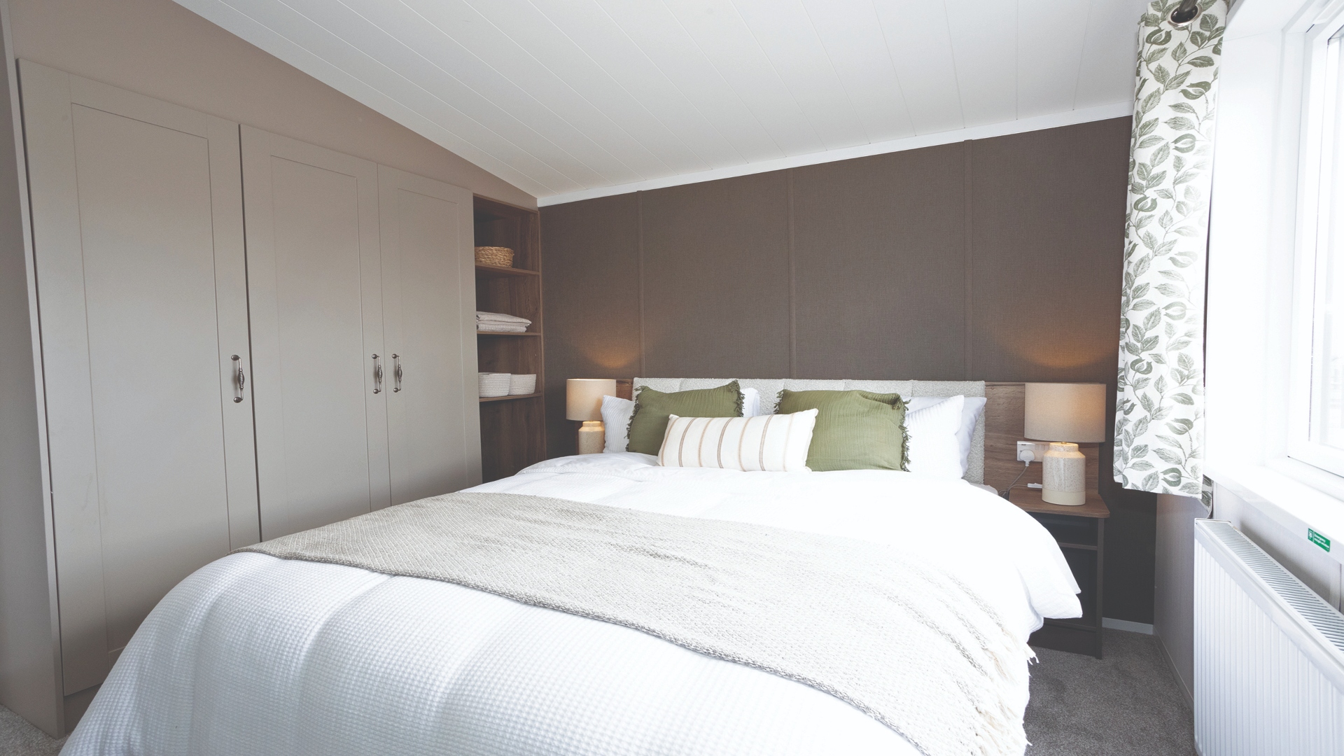 The Morlaix Lodge is available in three layouts, with either two or three bedrooms, the options are: 40ft x 13ft with two bedrooms; 40ft x 14ft also with two bedrooms, and 42ft x 14ft with three bedrooms. The twin beds in both of the 14ft models are standard domestic 3ft width. And the bed in the main bedroom is king-size.