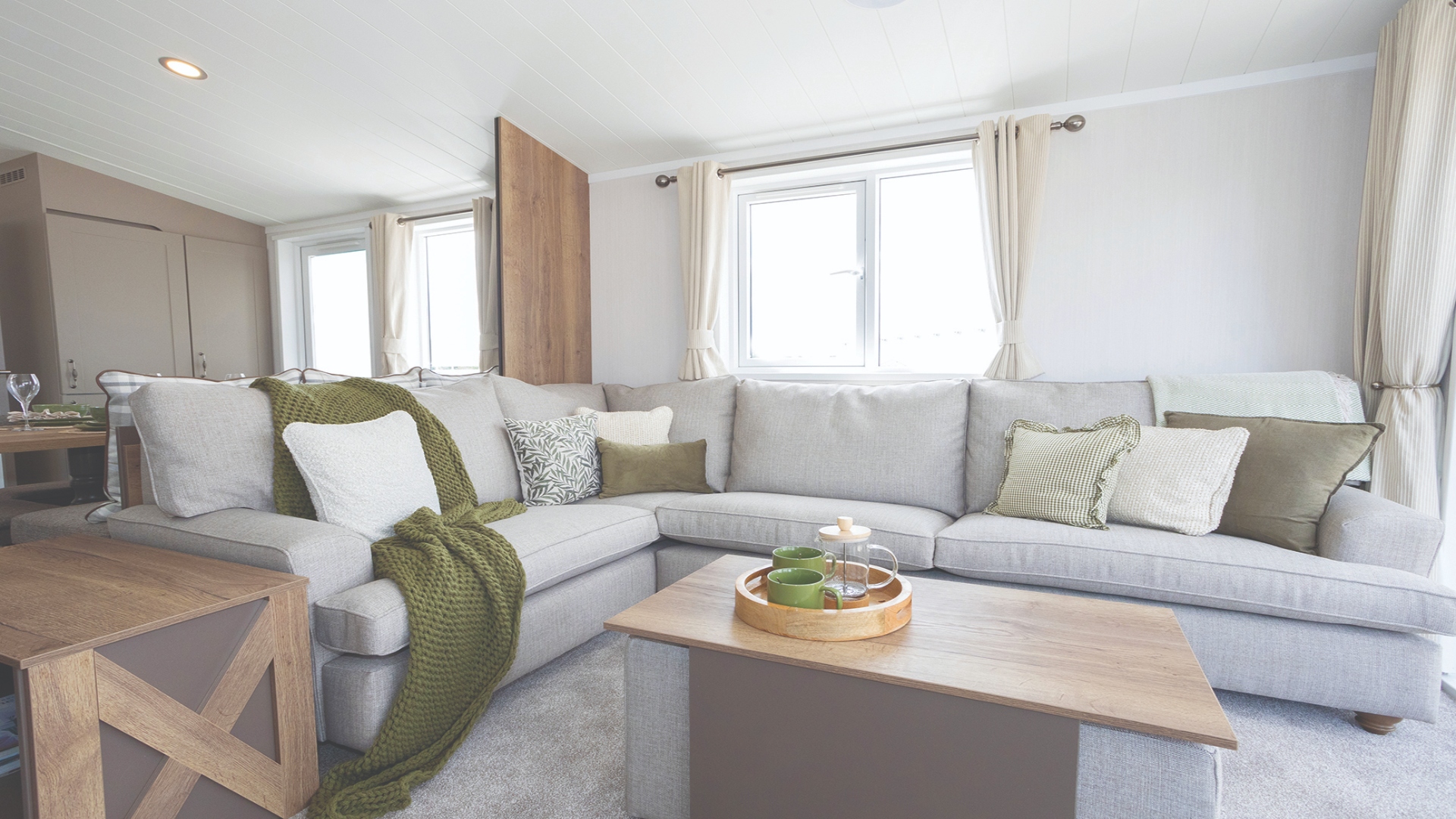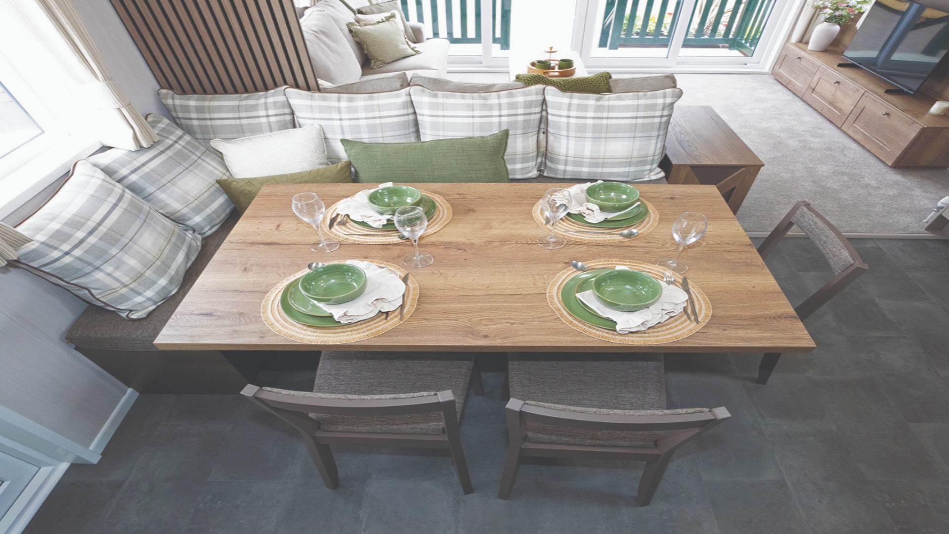 There’s more than a touch of farmhouse influence in the interior design of the new Morlaix, the latest addition to Swift’s holiday home lodge range. Panelled cabinet doors with neat circular handles, traditional check-patterned cushions and a dining suite that has a double chunky, sculpted central pedestal base, all contribute to the classic farmhouse-influenced character. The welcoming, cosy look is impressive as soon as you step inside.